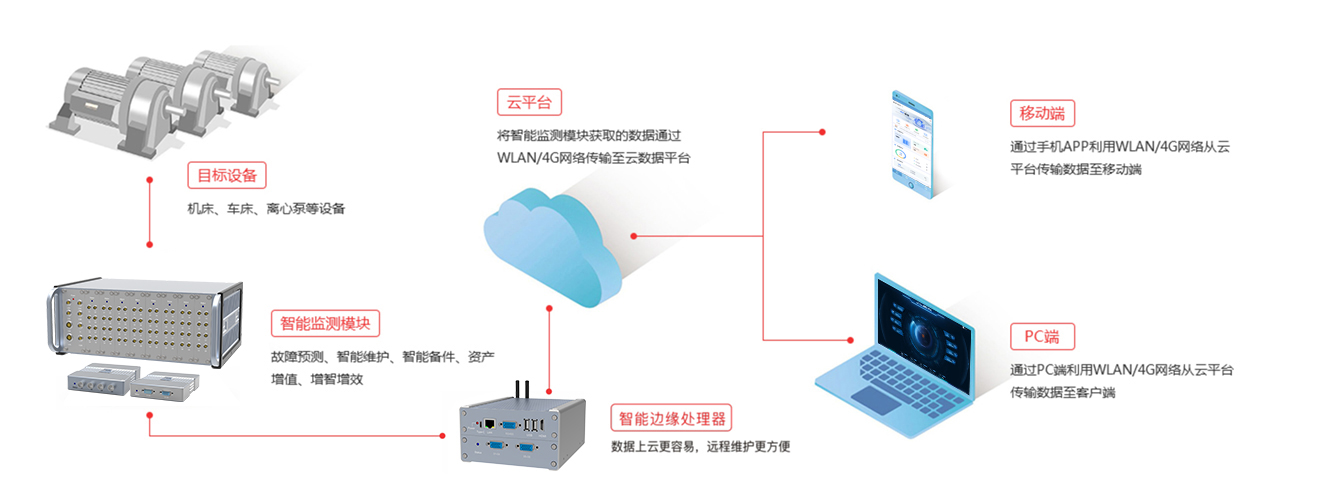 利用各類傳感器通過對機械設(shè)備電流、電壓、溫度、振動、噪聲、壓力等多維度數(shù)據(jù)監(jiān)測,為旋轉(zhuǎn)機械的安全運行提供多種參數(shù)的測量及早期故障的預(yù)報,具有安裝、維修方便,操作簡單,可靠性高等特點。